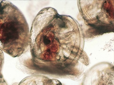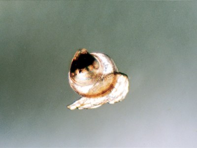 稚貝になる直前の成熟幼生です。約0.35ミリメートルです。