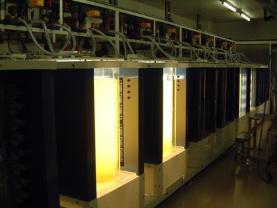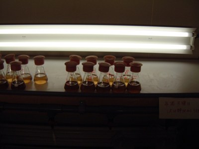 稚貝に変態後の中間育成時にはキートセラスだけを与えます。餌料である植物プランクトンの培養は、栄養塩を加え、通気と照明を与えたフラスコで行う通常の培養方法(最大7リットル)の他に、ここでは、最新の500リットル薄型特殊容器を用いた自動培養システムで一度に大量に培養を行っています。