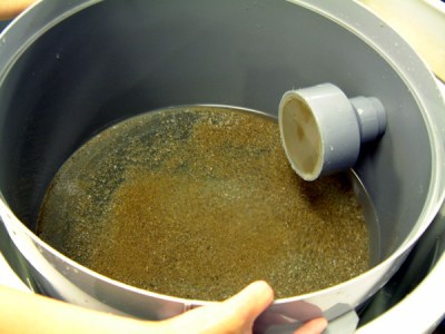 餌料を収容した水槽。この水槽から自動的に餌料が供給されます。