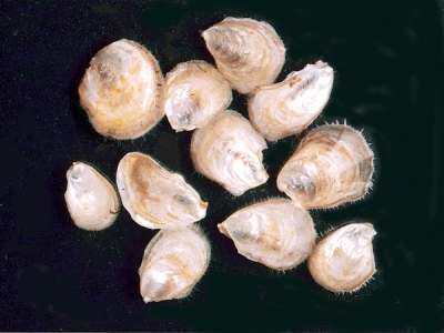 受精卵はこの後浮遊幼生となりますが、幼生は2週間ほどで沈着し稚貝となります。この間幼生には、浮遊珪藻といわれる餌(キートセラスにパブロバを添加したもの)を与えます。幼生の沈着には、約0.2ミリメートルに粉砕したカキ殻を付着基質として用います。