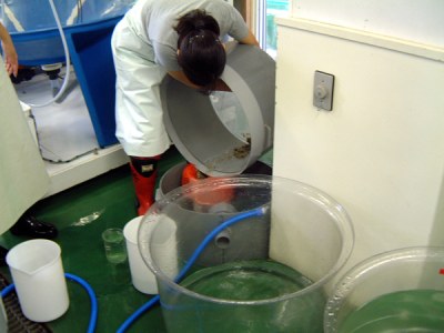 26基の水槽を使用して出来上がり(殻高3ミリメートル以上)で100万個の稚貝(円形水槽1基で約4万個)を育成できます。水温は、25℃で約40日間の飼育を行います。