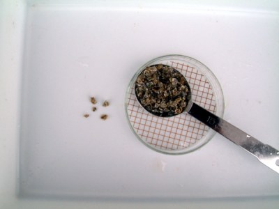 採苗は採苗用水槽内にふるいを設置し、その上に付着基質(粉砕したカキ殻)を敷き、付着直前の幼生を収容して行います。沈着は1週間程度で終了し、その後中間育成に移ります。