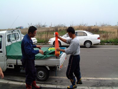 5月中旬から3~5ミリメートル程に成長した稚貝をタマネギ袋に収容し、海水入りの発泡スチロール製の箱で輸送します。