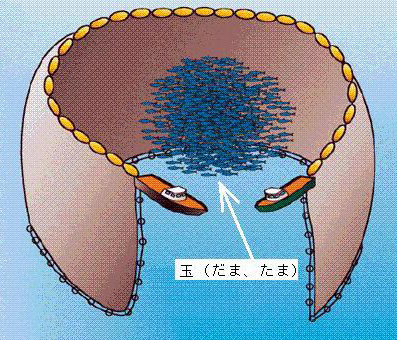 他に、まき網漁業などの網で魚群を囲んだ時に、魚群が逃げ場を失い丸い玉状になったり、産卵のため魚群が玉状になる。この玉状になった魚群のことを「たま、だま」ともいう。