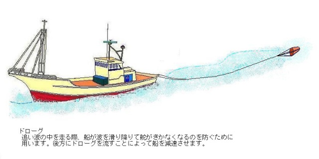 追い波の中を走る際、船が波を滑り降りて舵がきかなくなるのを防ぐために用いる。後方にドローグを流すことによって船を減速させる。シーアンカーと対象。