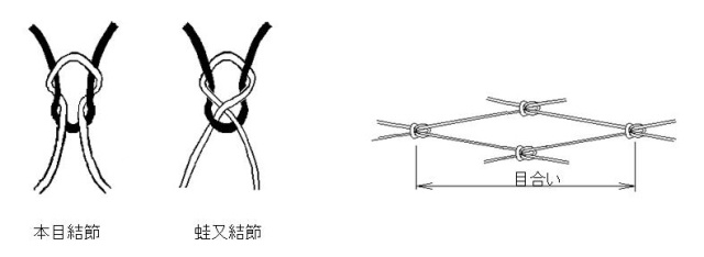 網目の大きさをいい、この表示には節目とミリメートル目が用いられている。節目とは、15.15cmの長さに含まれる結節数で示したものである。
