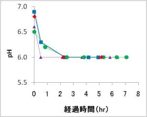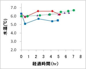 NH3とNH4+の割合は水温とpHの値で大きく変わり、NH4-N濃度と水温・pHの値からNH3を求めることができます。その値は最大で0.0009ミリグラム/リットルでした。ニジマスを9~12か月飼育した際の最高安全濃度は0.0125ミリグラム/リットルとされていることから今回の値は特に問題となる値ではないと判断されました。NH3の値は水温が高いほど、pHが高いほどその割合が高くなり、酸素濃度が低いほど毒性が増すと報告されています。今回の試験では水温が5~7度、pHが6と低く、加えて酸素量も8.5ミリグラム/リットル以上であったことがNH3の値に良い影響を与えたと考えられます。今後、さらに安全な輸送とするため、餌止め日数を2~3日に増やすなどの対策も検討し、輸送データを蓄積していく予定となっています。