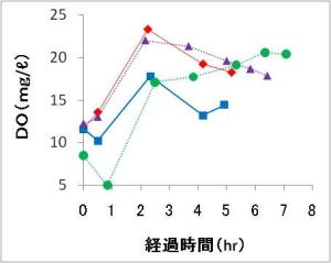 調査は遠別飼育場(遠別町)、初山別飼育場(初山別村)、信砂・暑寒別飼育場(増毛町)の4箇所への輸送時にそれぞれ実施しました(表1)。輸送した稚魚の平均体重は0.7~0.9グラム、収容密度(輸送重量/タンク容量×100)は6.0~7.2パーセントでした。なお、今回の試験では餌止め日数を1日としました。出発時(0時間)、輸送30分後、2.5時間後、5時間後、到着時にそれぞれ水温、DO、pH、電気伝導度を測定し、タンク内の水を採水しました。試水は冷凍保存したのち、後日、アンモニア態窒素(NH4-N)を水質分析しました。