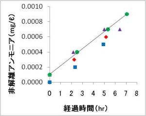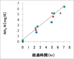 輸送中の水温は5~7度の範囲に、DOは概ね8.5 ミリグラム/リットル以上に維持されました。一方、pHは4回の輸送共に2時間後には6.0まで低下しました。ここで出発時のpHは、暑寒別、信砂では飼育池の注水部、初山別、遠別では稚魚の収容直後の値を示しています。飼育池注水部のpHは6.8~6.9ですが、稚魚を収容した直後には6.5~6.6へ低下しました。水質悪化の指標として測定したアンモニア態窒素の値を縦軸に経過時間を横軸にプロットすると時間が経過するとともに値が増加する傾向がみられました。収容密度10パーセントの条件下で輸送した際の調査結果によると2時間後のNH4-N濃度は2 ミリグラム/リットルと報告されています(清水, 1985)。今回の試験でもほぼこれに近い値が得られましたが、さらに時間が経過した7時間後には6.38 ミリグラム/リットルまで増加しました。この値はサケ稚魚にとって問題となる値なのでしょうか?ここで、アンモニアは水中においてNH3(非解離性アンモニア)あるいはNH4+(アンモニウムイオン)という形で存在していますが、このうちNH3が魚類への毒性が強いと言われています。