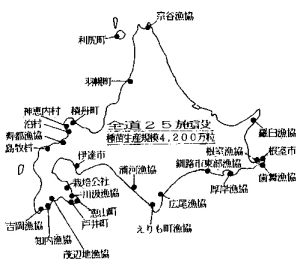北海道におけるエゾバフンウニの人工種苗生産は、施設の整備に伴い年々増加しています。現在、図1に示すように全道の25ヵ所に施設が設置(沈着期幼生からの飼育雄設を含む)され、殻径5ミリメートル以上の種苗で約4,200万粒の生産規模となっています。