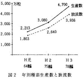 図2は、年ごとの種苗生産数量と漁場放流数、さらに事業実施漁協数を示したものですが、いずれも年々増加していることが伺えます。
