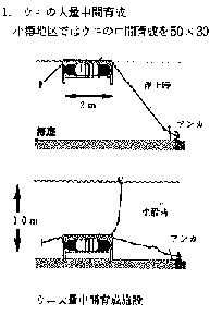 平成6年は高水温のため中間育成篭内での斃死が約4割にまで達しました。この斃死を低減すること、また中間育成の管理労力を削減することを目的に、海底設置式の中間育成施設(タテ2.0xヨコ1.5メートル)を開発しました。篭式よりも海底に設置しているため、振られがすくないこと、また水深10メートルに設置するため・日中の温度上昇も少ないと考えられます。この施設は通常は海底に設置しておき、給餌等の施設の管理が必要なときには、浮上させて管理する浮沈装置を取り付けました。6月15日から栽培公社産のウニ種苗を用いて中間育成を開始しました。ほぼ2週間おきに施設を浮上させてコンブ、人工餌料などを給餌しました。8月中旬まで篭で行っている中間育成と同様に良好な成長を示していましたが、後志管内では斑点症が発生し、翌年4月までの中間育成の予定を急きょ中止し、天然漁場に放流しました。