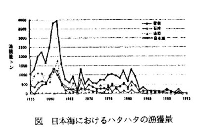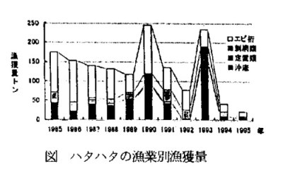 - 日本海のハタハタ漁獲量は1962年の4,000トンを最高にその後減少し、1994年は41トン、1995年には21トンと過去最低を記録。