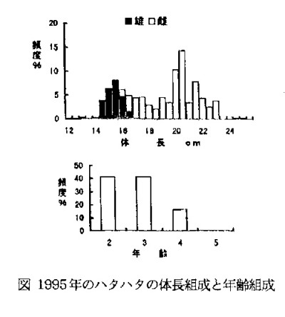- 1995年の漁獲物は大型で、特に雌では3歳魚主体、次いで4歳魚が多かった。
