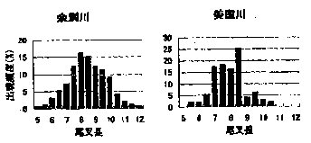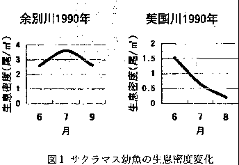 図1は、少々古いデータなのですが、積丹半島にある禁漁河川の余別川と、規制のない美国川における放流ヤマベ、すなわちサクラマス幼魚の生息密度変化を調べたものです。余別川に比べて美国川の減り方が激しいのが分かります。でも、これだけでは釣りによる減少がどうか分かりません。そこで、同じ年の8月の幼魚の体長組成を調べてみました(図2)。すると余別川では正規分布型を示すのに美国川では9センチメートル以上の魚はほとんどみられませんでした。これは釣りによって大きな魚が釣られてしまった結果と考えられます。このような、釣りが増殖事業に影響を及ぼしていることを示すデータは他にも沢山あります。