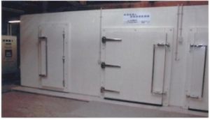 一般に、水産物を乾燥すると表面からの水分蒸発と内部からの水分拡散のバランスが崩れ、乾燥効率が低下する「スキンエフェクト」を生じます。このため、乾燥を止めて数日間、内部拡散を促進させる「あん蒸」を行う必要があります。また、乾ほたて貝柱製品において送風機械乾燥と併用して行われている天日乾燥では、天候により、中間製品の屋内外の移動を頻繁に行う必要があります。このため、従来の製法では乾ほたて貝柱は製品となるまで、多くの日数と人手を要しています。こうした背景から、乾ほたて貝柱の乾燥時間を大幅に短縮するために、湿度制御による連続乾燥技術の開発を実用化レベルで行いました。この技術は、国の補助事業である「平成10年度特定中小企業集積支援技術開発事業」の中で、紋別市内のダイサン木村商店と支援機関である網走水試紋別支場が産官共同で開発したものです。