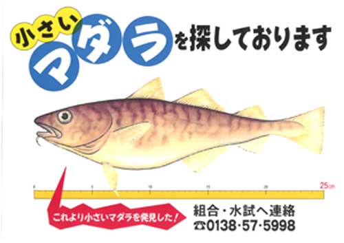 函館水産試験場では、恵山町の「海を育てる会」のご協力を得ながら国費事業ーマダラ放流基礎調査で、「小さいマダラ」に関する情報提供を道南の各浜にお願いしてきました。(図1)