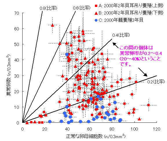 2000年度は耳吊り養殖された2年貝(1+)と籠養殖された3年貝(2+)の卵巣内の異常卵の出現状況を比較しました。各個体ごとに写真を6枚ずつ撮り、正常卵と異常卵の数を数えたのが図2です。異常卵の比率がわかるように、比率の等値線を描きました(図中の説明を参照)。耳吊り養殖2年貝では、籠養殖3年貝より明らかに異常卵率が高いことがわかります。また、耳吊り養殖2年貝では異常卵率に個体差が大きいことがわかります。