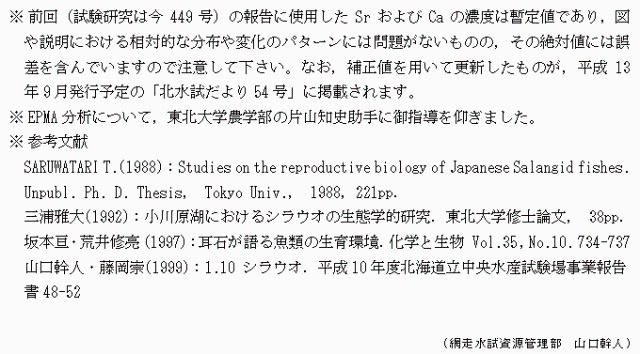 試験研究は今 No.455「耳石のストロンチウム・カルシウム比(Sr/Ca)から判別した石狩におけるシラウオの河川遡上群と沿岸残留群の体長」(2001年8月16日)