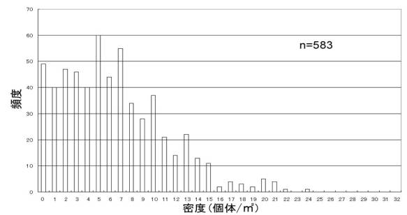 表1に示したように、平均密度は6.38個体/平方メートルで、過去2年間と同様高密度が維持されています。また、ホタテガイの漁場における分布の程度を示すIδの検定結果から、3年間、集中分布が維持されており、2001年度の密度の頻度分布が示すとおり(図1)、常呂C海区内のホタテガイ密度は、放流3年目でも相当なバラつきが存在することを示しています。