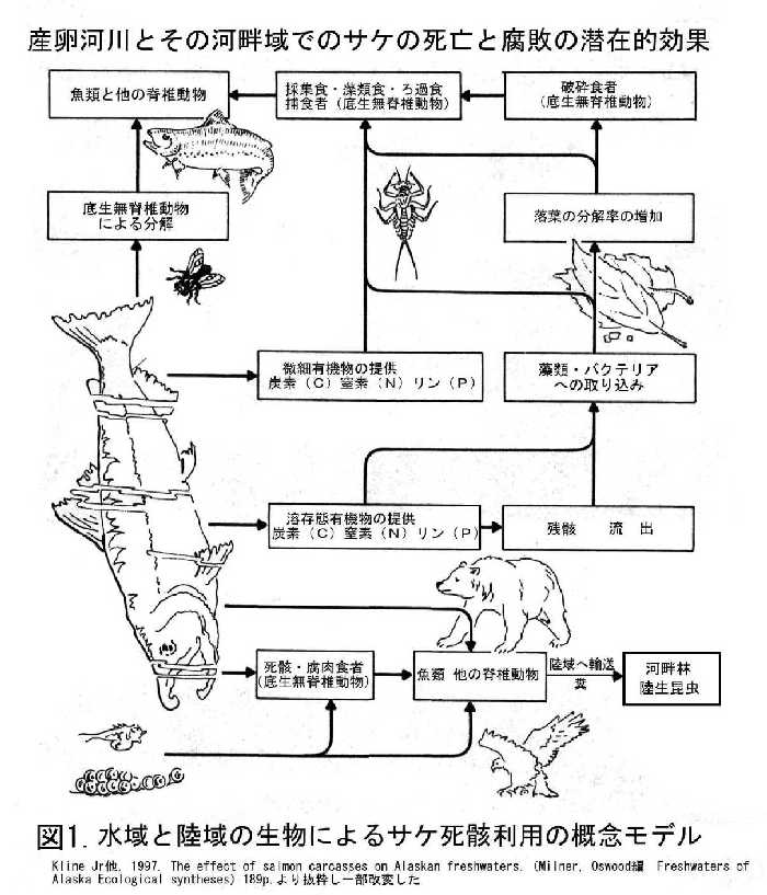 遡河性魚類であるサケとその仲間のカラフトマス、ベニサケ、ギンザケなどが、森・川・海の栄養循環で大切な位置にいることが、ここ数年、北アメリカ太平洋沿岸でさかんに研究され、それを利用した事業が行われています。これらアメリカやカナダの研究や事業では、川で産卵して死んだサケが主人公です。そのサケは、Marin Derived Nutrients (海洋由来栄養物質)と定義され、略してMDNと呼ばれています。サケは、海で成長することから、海の恵みを蓄えて川に運ぶことが重要視されているのです。MDN、このサケの産卵後死骸には、日本では特別な名前はありません。ここでは、この産卵して死んだサケをホッチャレと呼びます。森・川・海の栄養循環では、通常、栄養を作るのは山の木々で、落葉として生産した栄養物が川を通じて海へと流れ、順繰りに生物に取り込まれます。ところが、サケは、海で栄養を蓄え山へと遡上することにより、逆の栄養循環を行っているのです。ホッチャレは、川にすむ昆虫や、クマ・キツネ・鳥など山の動物の餌となります。また、その栄養分は腐って溶けて、川の中の藻類に取り込まれますし、クマ・キツネらによって陸域へ運ばれ、その死骸や糞が森の木々の肥料になります(図1.)。