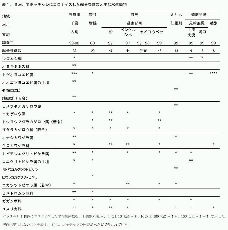 この研究目的は、北海道でホッチャレが河川生物に与える影響を解明しようということに端を発しました。まず、どんな河川生物がホッチャレに集まり群がるか調べようということになりました。この研究は、水産ふ化場病理環境部の伊藤富子さんと行ったものです。1997年から3年間、秋から冬にかけて、表1にある道内の6河川で調査を行い、ホッチャレに集まる底生無脊椎動物や魚類を調べました。(底生動物とは、川の生物を代表するグループで、多くはカゲロウの幼虫などの水生昆虫で、川に生息するサケ科魚類であるヤマベやアメマスなどの主要な餌ともなっています。)その結果、約55の分類群の底生動物と2種の魚類が、ホッチャレに群がっているのが確認されました。そのうち、トビケラ目のトビモンエグリトビケラ属(Hydatophylax sp.)と端脚目のヨコエビの仲間(Amphipoda)が特に多くホッチャレに集まりました。