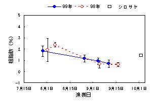 1.カラフトマスの水分は漁期初めの7月下旬から終わりの9月中旬にかけて2~3%増加、粗脂肪は約1~2%減少しました(図1、2)。なお、これらの成分は、雌雄および魚体の大きさによる明らかな差がみられませんでした。