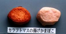 5.現在、カラフトマスの冷凍すり身を利用した揚げかまぼこ製品について商品化を進めています(写真1)。また、超高圧ハムの製造方法について「サケ・マス肉を用いたハム様食品の製造方法」として、特許申請(特願 2001-233449)を行っています。