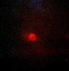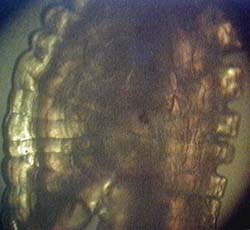 調査では市場で購入したニシンを研究室へ持ち帰り、頭骨内部から注意深く耳石を取り出し、それを顕微鏡下(100倍)で観察します(下図、左)。この時、耳石表面に強い蛍光を照射すると、写真(下図、右)のように、中心域が赤く発色する耳石が見つかることがあります。これが人工種苗ニシンを表す“印”です。実は、すべての人工種苗ニシンには放流する前にあらかじめ、耳石にALC(アリザリンコンプレクソン)という“蛍光標識”を付けています。そうすることで、天然で発生したニシンと人工種苗ニシンを確実に識別することができます。