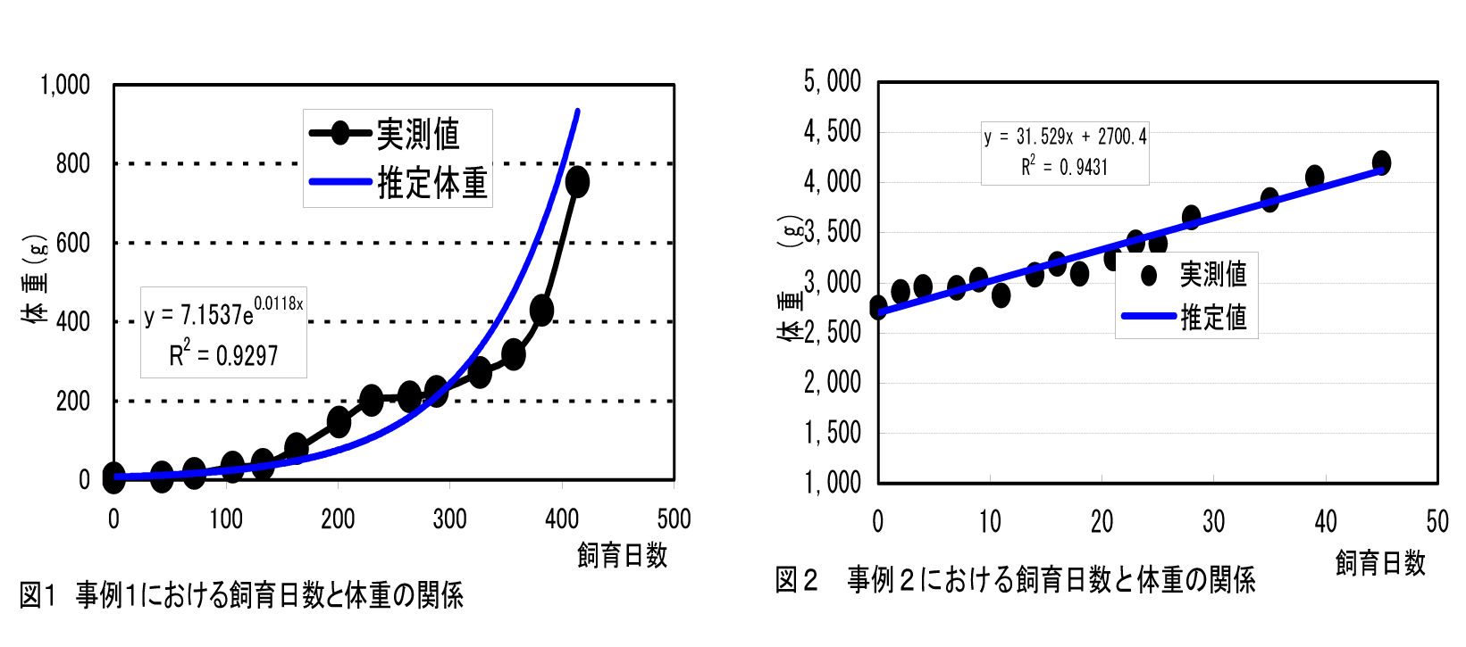 図2には、2例目の飼育実験で得られた飼育日数と体重の関係を示しました。飼育日数が短期間であることにもより、成長量はほぼ直線的でした。ここでも近似式を求めて、成長式としました。