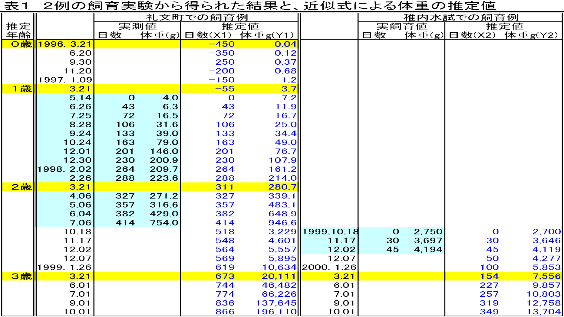 これら2例の成長式を基に、ミズダコのふ化時期と年齢成長の関係を推定してみました(表1)。