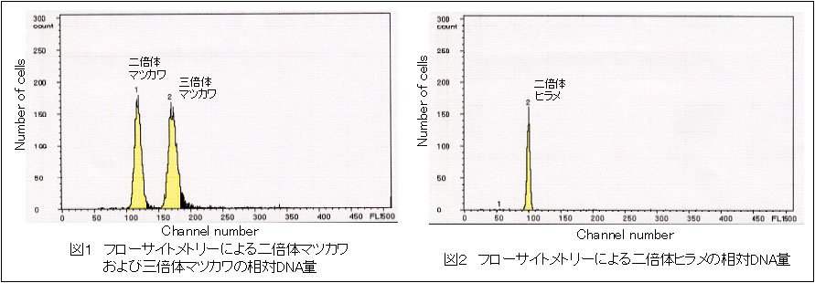 また、二倍体ヒラメの平均値は99.5で、二倍体マツカワは二倍体ヒラメの1.17倍となり、マツカワの相対的DNA量はヒラメより若干多いことが分かりました。今後、両種の間で、交雑種を作出したとすると、その判定にも本手法は威力を発揮するはずです。