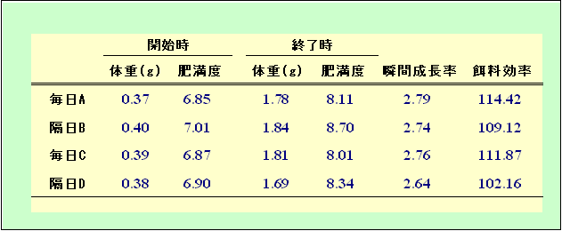 表1に試験のデータをまとめました。瞬間成長率と餌料効率については毎日給餌群がやや高い傾向にありましたが、その差は僅かです。いずれにせよ瞬間成長率は2.5パーセント、餌料効率は100パーセントを超えており良好な成績と言えます。一方肥満度については隔日給餌群が毎日給餌群より高い値を示しました。