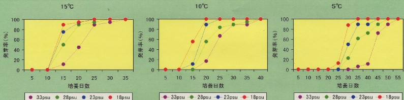 先程、群落の拡大に栄養生殖が寄与していると言いましたが、人為的にスガモ群落を造成する場合には、種子による造成が有効と考えられます。つまり種子は大量に確保することが可能であり、最適な環境で発芽段階や付着器官である根の形成までの初期生長を保護して海域に蒔けば、種子を直接蒔くよりも確実に造成が行えると考えられます。また、最適条件を把握することでスガモ側からの造成適地が見えてきます。そこで室内実験により、水温と塩分濃度を変えて種子の発芽の状況を調べてみました(図3)。その結果、スガモは5~15度の範囲では、高水温ほど発芽が促進されること、さらに塩分濃度が18~33psuの範囲では、塩分濃度が低いほど発芽が促進されることが明らかとなりました。