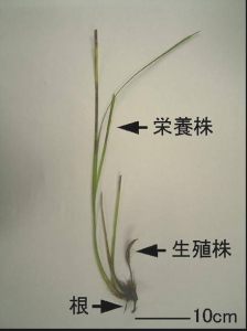 スガモは、二通りの方法によって群落を維持、拡大することが知られています。その方法とは、種子によって仲間を増やす有性生殖と呼ばれる方法と、株の基部から枝分かれによって新しい株を形成して仲間を増やす栄養生殖と呼ばれる方法です。それでは、それぞれの繁殖時期はいつ頃なのでしょうか?図1は余市町潮見地区における1平方メートルあたりの栄養株数と生殖株数の季節変化を示しています。生殖株は4月から観察され、7月には種子の放出があり、8月に生殖株は流失しました。このことから、当海域におけるスガモの生殖株の形成は年1回で時期は4~7月、種子の放出は7月であることが明らかになりました。栄養株の密度は、成熟時期後の9月に最低となり、その後、増加傾向を示して春季に最高となりました。この増加は11~3月にかけて株の基部から新しい株の形成が盛んに行われることから、栄養生殖が個体数の増加に関与していると考えられます。このことから当海域における栄養生殖の時期は、主に冬季であることが明らかとなりました。