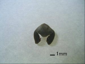 それでは、初めにスガモとはいったい何者なのでしょうか?実は、このスガモはコンブのように、私たちが一般に“海藻”と呼ぶものとはちょっと違います。確かにスガモも“かいそう”と呼ばれますが、漢字で“海草”と書きます。スガモは多くの陸上植物と同じように花を咲かせて種子を作る海産顕花植物の仲間なのです。スガモの外見は一見すると陸上の草とよく似ていて、草体は栄養株(葉を形成する株)、生殖株(種子を形成する株)ならびに根の部分に大きく分けられます(写真1)。種子は1つの生殖株に8~9個程度形成され、ちょうど船の“いかり”の様な形をし、腕状の部分にはハブラシのような細かな毛があり、海底の起伏や海藻などの基部に引っ掛かりやすくなっているようです(写真2)。