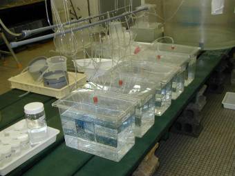 試験に用いた幼生を得るまでの手順は,次のとおりです。即ち,産卵誘発で得た受精卵を4回洗卵した後,母貝別に10リットルを採取し,別の12リットル角形スチロール水槽(364×206×271ミリメートル)に収容し,15℃恒温室に静置しました。翌日,浮上した幼生を別の12リットル角形スチロール水槽に分離し,新鮮な精密濾過海水を添加して10リットルとしました。さらに,その翌日母貝別に収容していたD型幼生を回収し,それらの幼生を混合したものを試験に用いました。幼生の飼育水槽には,1試験区あたり20リットル角形スチロール水槽(412×248×301ミリメートル,飼育水量15リットル)を2個用いました。幼生は,当初の飼育密度が飼育水1ccあたり2個体になるように収容しました。飼育水には通気を行い,清新さを保つために2日毎に全量交換しました。