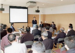 日本海での沖合底びき網船の休漁明けの操業を翌日に控えた平成16年9月14日、稚内水産試験場大会議室において、稚内機船漁業協同組合と構成漁業会社の社長さんや漁労長さん達を含む関係者30余名に水試、支庁、市役所等関係者を合わせた約50名の出席のもと、毎年恒例の機船ミニプラザが開催されました。