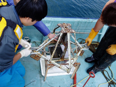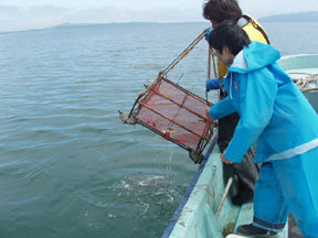試験カゴに収容したホタテガイの成長や生存を調べる。写真は着底カゴ