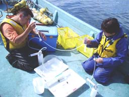 写真 3 自作した採水器で湖底直上の海水を吸い上げる