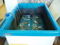 採集した泥を分析した結果、水深が深くなるほど全硫化物量は増加し、粒径が細かいシルト(ほぼ粘土に近い)が多くなる傾向がありました。 しかしながら、これらの底質に由来する要因がホタテガイの生残に直接影響しているかどうかについては不明であり、 他の環境要因についても検討する必要がありそうです。 この点について、ホタテガイが生息する湖底直上の水質を調べるため、自作の採水器を使った生息環境の調査も始めたところです(写真3)。 一般に、生物に対して極めて強い毒性を示す物質としてアンモニアが知られています。 そこで、アンモニアに対するホタテガイの耐性を室内試験で明らかにしようとしました。 写真4に示すような試験水槽を用意して、全アンモニア濃度の異なるいくつかの試験区にホタテガイを収容しました。 さらに、水素イオン濃度(ペーハー)についても変化させました。 その結果、ホタテガイのアンモニアに対する耐性は極めて強く、全アンモニア濃度及びpHが高い試験区でなければ死なないことが分かりました (図2)。 これらの試験区の全アンモニア濃度やペーハーは能取湖で観測される通常の値と大きく異なることから、 その他の要因(たとえば水温や塩分濃度など)の検討も加えながら試験を継続する必要があります。