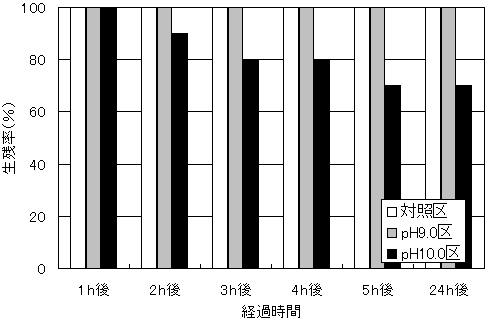 図 2 全アンモニア濃度100ミリグラム/リットルとしてペーハーを調整した試験区に収容したホタテガイの生残率