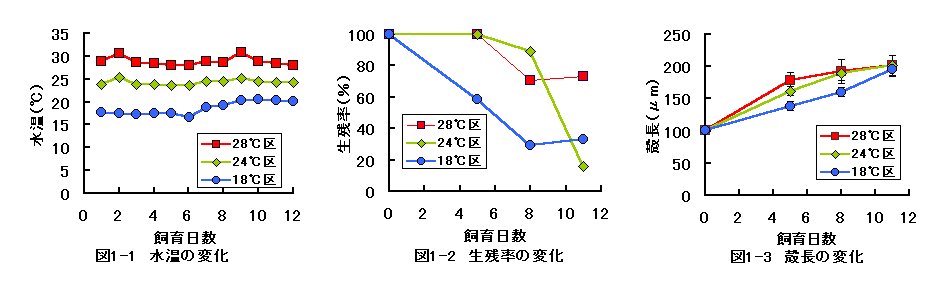 試験期間中の水温を図1-1に示しました。18度区,24度区および28度区の平均水温はそれぞれ,18.6度,24.3度および28.8度でした。飼育の結果,18度区では,幼生収容後に生残率が緩やかに低下し,飼育11日目には生残率が33.3パーセントとなりました。(図1-2)。平均殻長は,11日目に195ミクロンとなりました(図1-3)。24度区では,飼育8日目まで斃死が見られませんでしたが,それ以後生残率が低下し,11日目には生残率が16.0パーセントになりました(図1-2)。生残率の低下した原因についてはわかりませんでした。殻長は,飼育8日目には189ミクロン,11日目には203ミクロンとなりました(図1-3)。28度区では,大きな斃死は見られず,飼育11日目においても生残率は73.3パーセントでした(図1-2)。殻長は飼育5日目に178ミクロンとなりました(図1-3)。その後成長は停滞し,8日目に殻長193ミクロン,11日目には202ミクロンなりました(図1-3)。これらの結果から,着底期までの成長は飼育水温が高いほど速くなることがわかりました。また,アサリ浮遊幼生は,殻長200ミクロン前後で成長が停滞し,着底後に再び成長します。そのため,飼育11日目にすべての区で殻長がほぼ同じになったと考えられました。