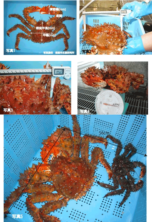 水揚げされたハナサキガニは,根室市水産研究所で飼育されていたため,現地に赴きこのカニの体重や甲長(眼の付近の甲羅のくぼみから後端まで)、甲幅(甲羅の最大幅)、掌節幅の測定を行いました(写真1)。