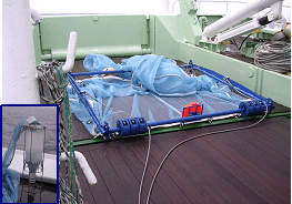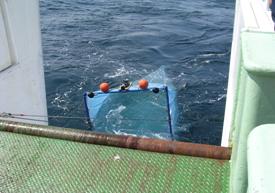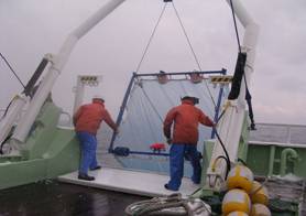 仔稚魚は遊泳能力があるので,口径の小さいプランクトンネットや丸稚ネットでは仔稚魚を確実に採集することが困難です。そこで,新たに採集具FMTを使用することにしました(写真1)。FMTは2×2メートルの正方形フレームに網目幅1.5ミリメートルと細かい網目の網地を用いて,コッドエンドは仔稚魚を保護するためにバケット式としました。日本海のスケトウダラの仔稚魚は南部に位置する産卵場の桧山海域や岩内湾から,未成魚の成育場である宗谷海域,さらにはオホーツク海まで広域に分布することが予想され,これらの海域を網羅するために,二隻の試験調査船(おやしお丸,北洋丸)で共同調査を実施しました。これらの二隻は船尾の漁労設備が大きく異なりますが,おやしお丸ではAフレームを用いて網を吊り下げて投網・揚網作業を行い,北洋丸ではFMTのフレームにゴムのローラーを細工して取り付け,スリップウェイを使って投網・揚網作業を行えるようにしました(写真2)。
