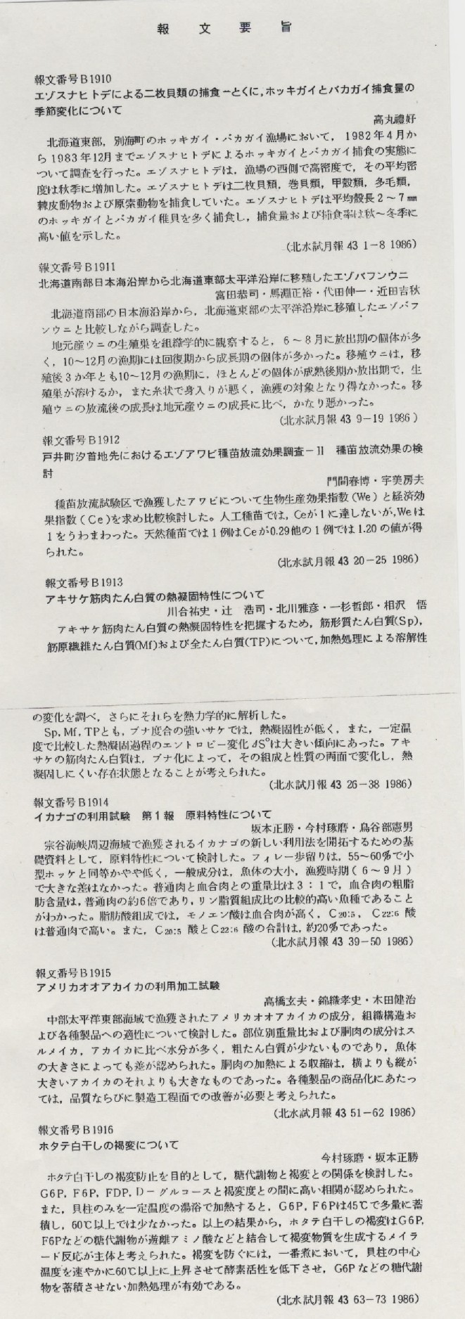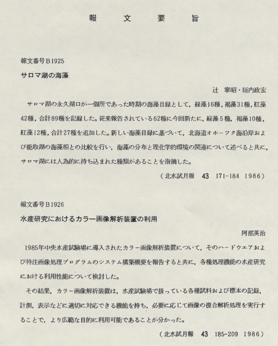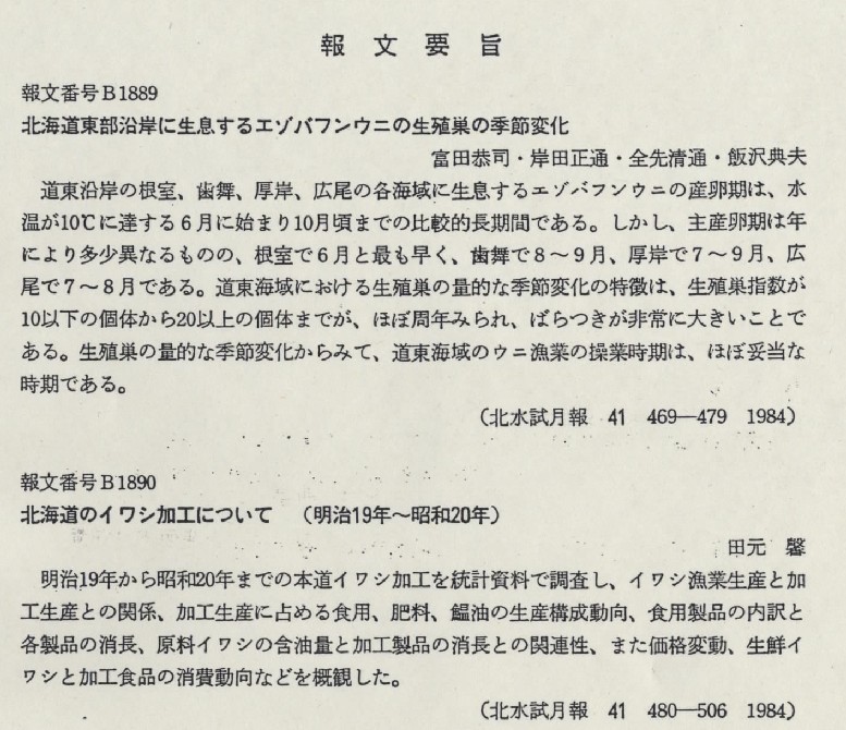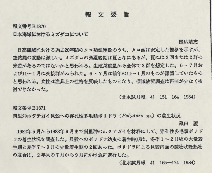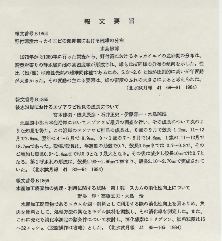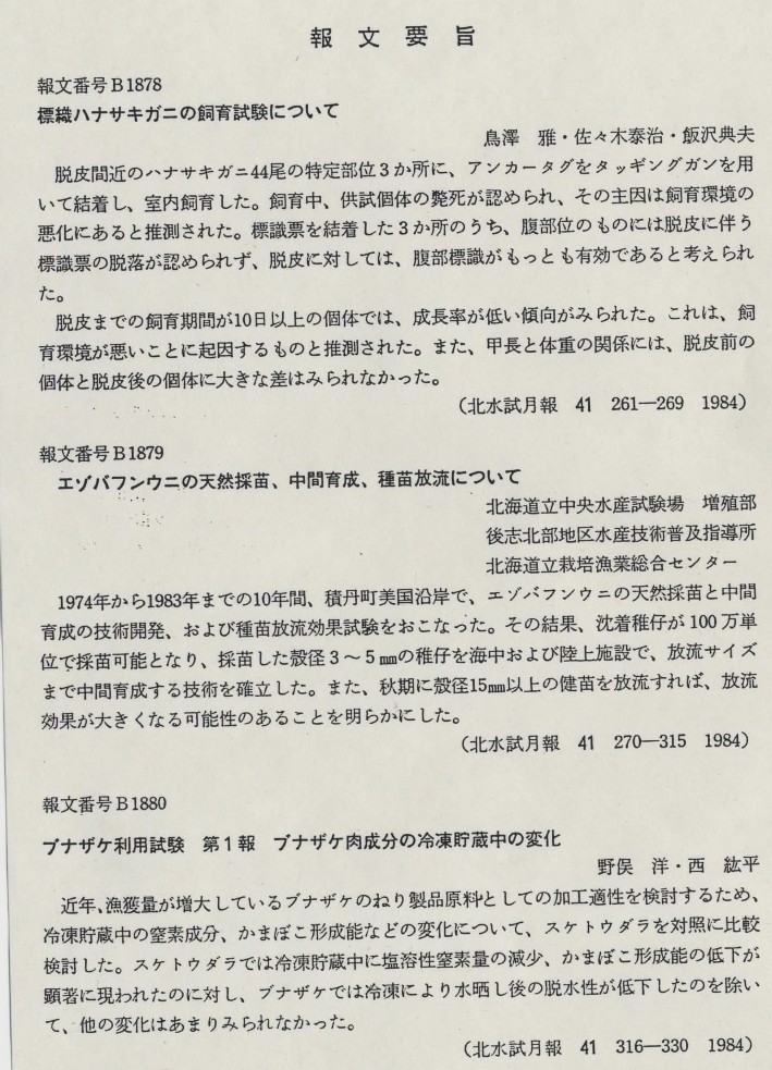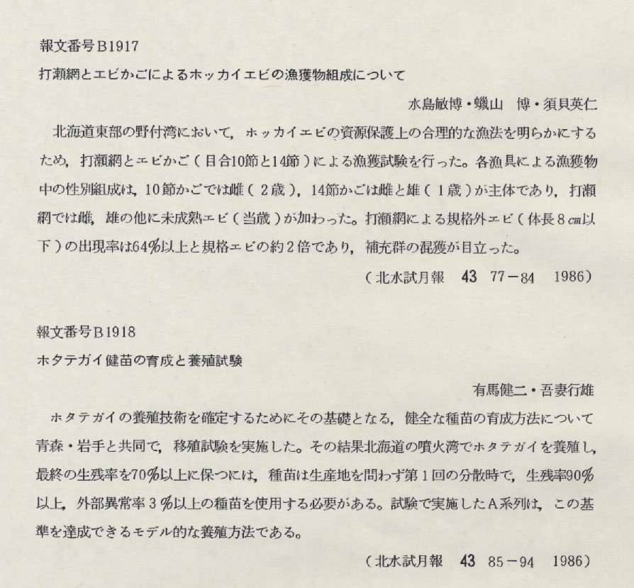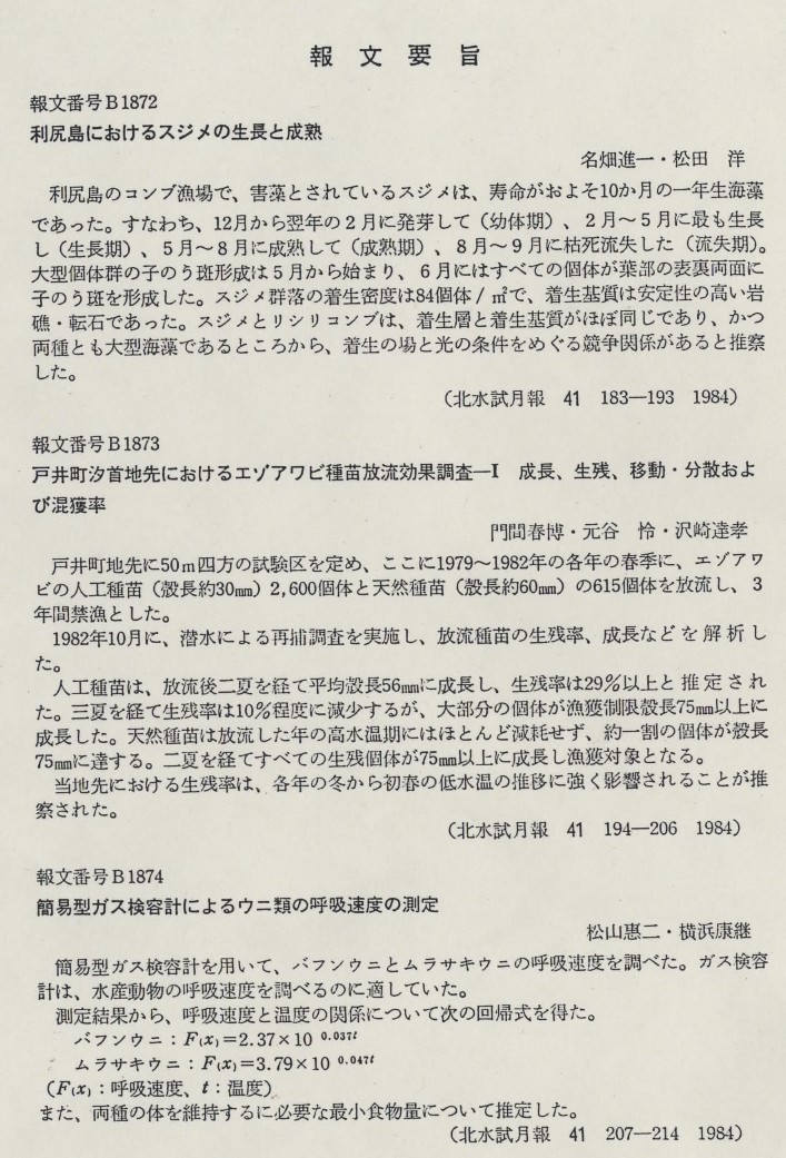 標題:戸井町汐首地先におけるエゾアワビ種苗放流効果調査-2 種苗放流効果の検討著者:門間春博・宇美房夫