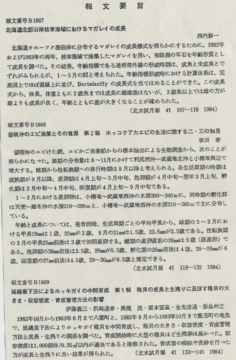 標題:延縄垂下法によるホッキガイの中間育成 第1報 稚貝の成長と生残りにおよぽす稚貝の大きさ、収容密度、育成管理方法の影響