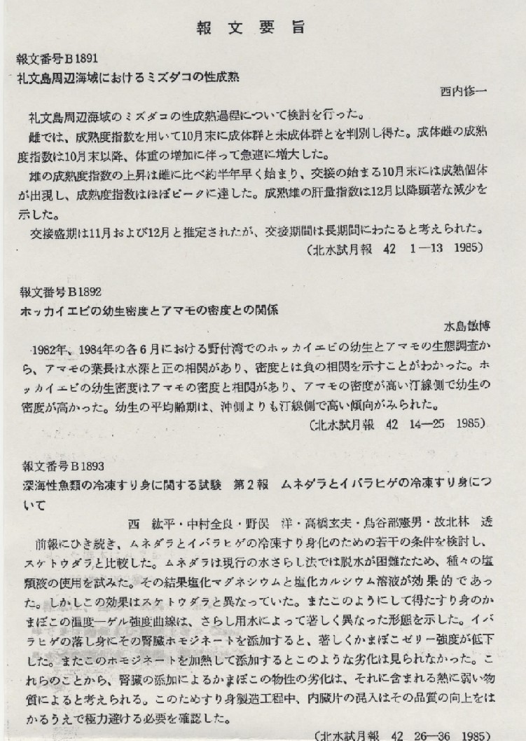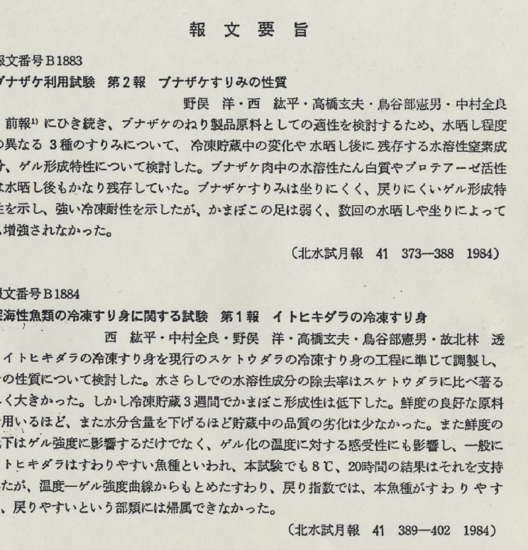 標題:深海性魚類の冷凍すり身に関する試験 第2報 ムネダラとイバラヒゲの冷凍すり身について