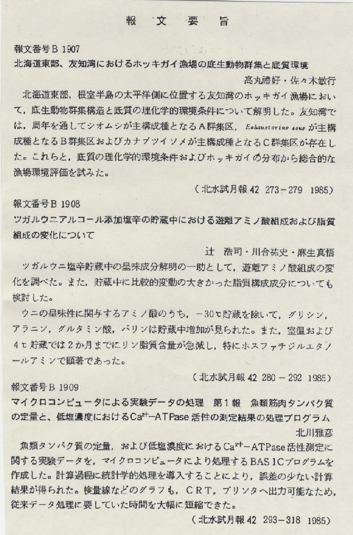 標題:マイクロコンピュータによる実験データの処理 第1報 魚類筋肉タンパク質の定量と、低塩濃度におけるCa2+ーATPase活性の測定結果の処理プログラム