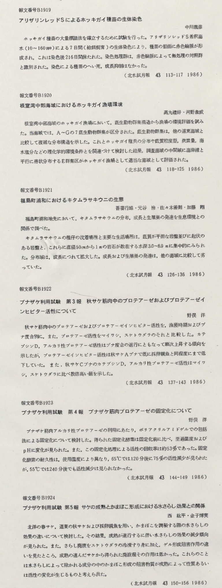 標題:プナザケ利用試験 第4報 ブナザケ筋肉プロテアーゼの固定化について